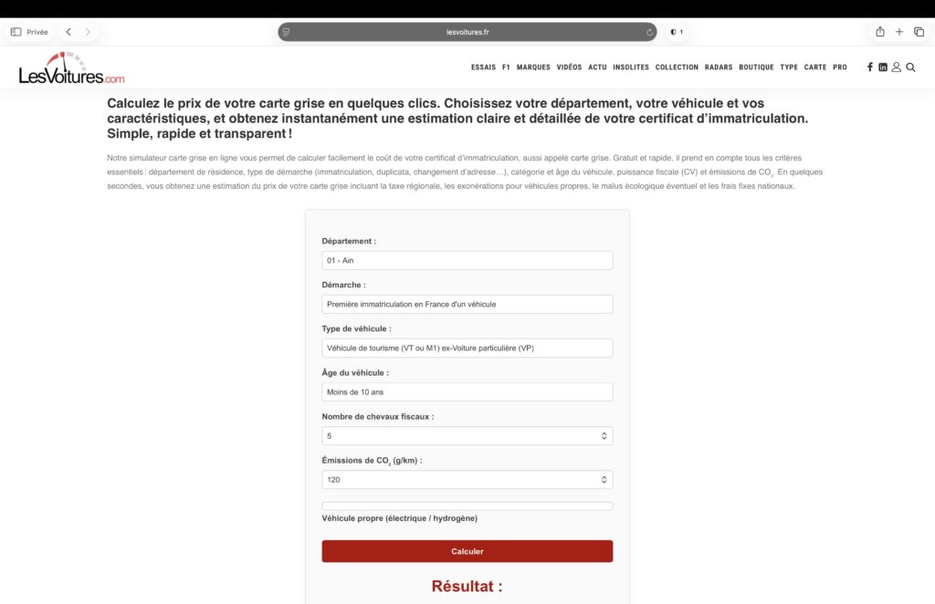Lien du simulateur de carte grise